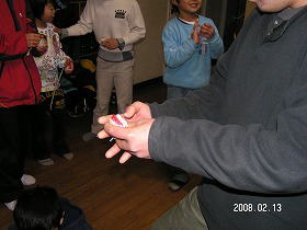 ![]() こまの面白さは技だけではありません。さまざまな状況を作り出して、そこで、のこまの動きを楽しみます。 |